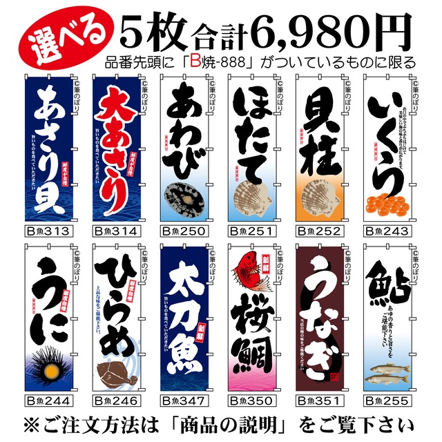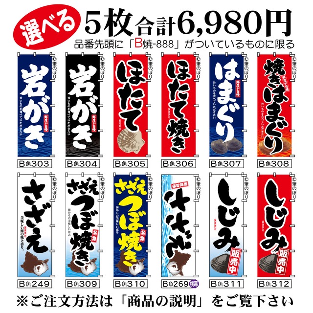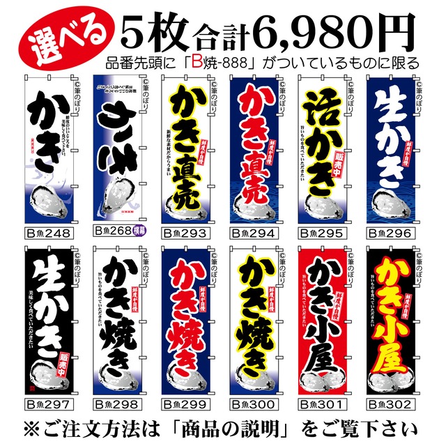 【送料無料-選べる5枚セット】岩牡蠣 のぼり旗|ほたて焼き さざえつぼ焼き 他11種|手書き筆文字[b5-016]