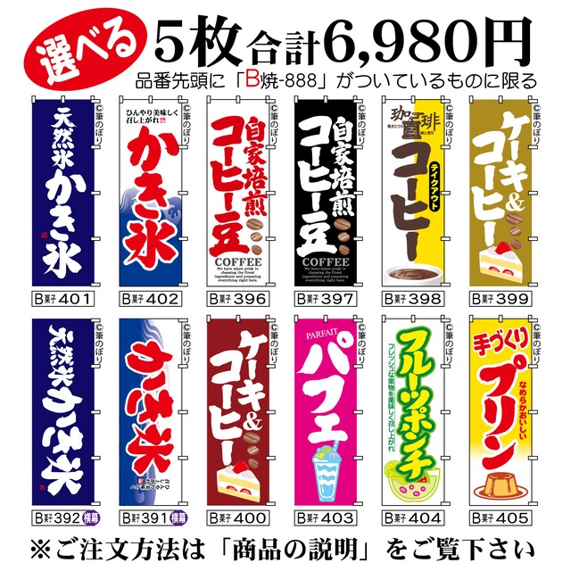【送料無料-選べる5枚セット】天然氷かき氷 のぼり旗|自家焙煎コーヒー豆 パフェ 他11種|手書き筆文字[b5-023]