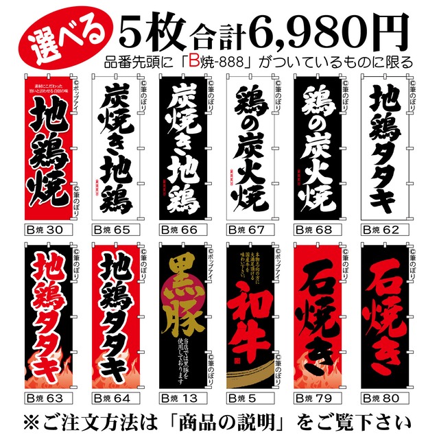 【送料無料-選べる5枚セット】炭焼き地鶏 のぼり旗|地鶏たたき 石焼き 他11種|手書き筆文字[b5-006]