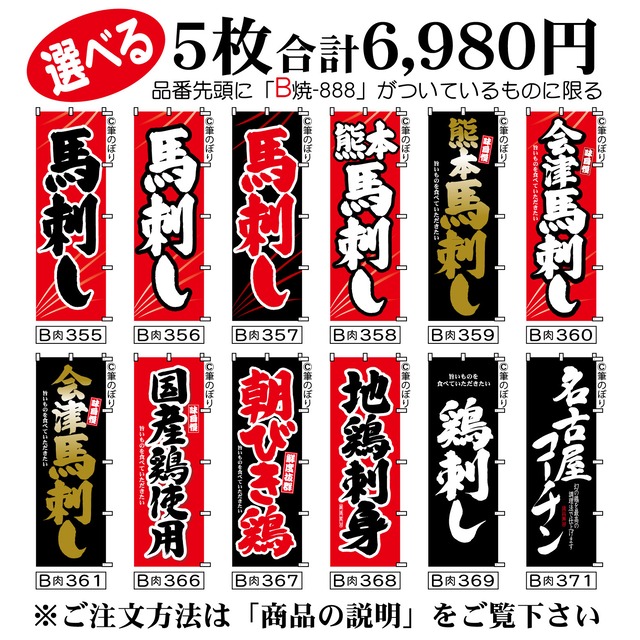 【送料無料-選べる5枚セット】馬刺し のぼり旗|熊本馬刺し 地鶏刺し 他11種|手書き筆文字[b5-021]