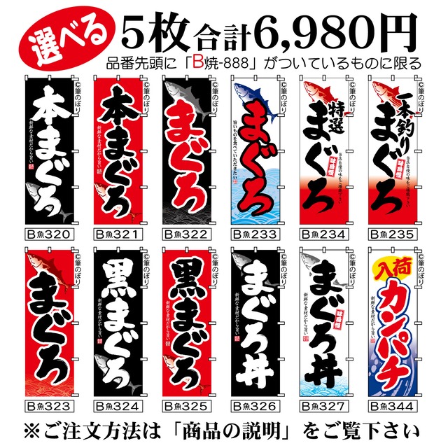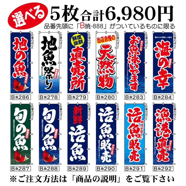 【送料無料-選べる5枚セット】鮮魚 のぼり旗|大漁旗 地魚 他11種|手書き筆文字[b5-010]