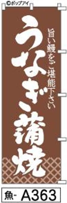 「のぼり【うなぎ蒲焼】茶に白抜き筆文字[魚A363]は、誘客力に優れた既製品のぼり旗です!特に鰻屋さんにおすすめの一品となっております。鰻の魅力を引き立てる茶色の背景に、肉太でしっかりと書かれた白抜きの和風筆文字は、視認性が抜群で通行人の目を惹きつけます。
