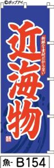 この「のぼり【近海物】青に赤の筆文字[魚B154]」をぜひ店舗の一部に加えて、四季を問わず活用してください。あなたの販売促進に大いに役立つアイテムです!
