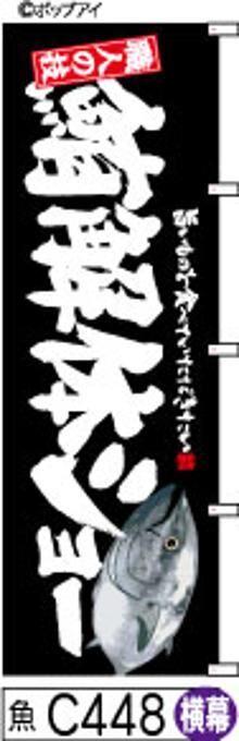 黒地に白抜きで手書きされた筆文字が、見る人の目を奪う横幕です。マグロの迫力あるイラストが印象的で、まぐろ解体ショーの雰囲気を一層盛り上げます!イベントや店舗の外観を華やかに演出し、訪れるお客様の期待感を高めます。