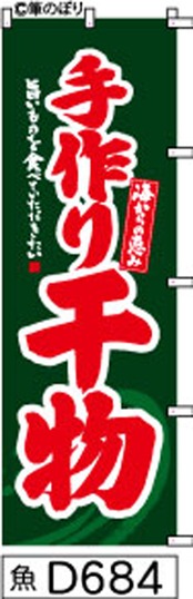 「のぼり【手作り干物】緑に赤の手書き筆文字[魚D684](商標登録番号6807113)」