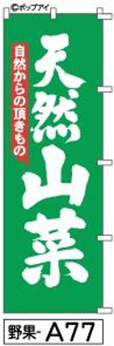 「天然山菜 のぼり【野果A077】」は、八百屋さんや道の駅での使用に最適です!緑を基調にしたシンプルなデザインは、白抜きの文字が際立ち、遠くからも視認性抜群!お客様の目を引くこと間違いなしです。新鮮な山菜の魅力を引き立てるこののぼりを利用して、売場を華やかに演出しましょう!