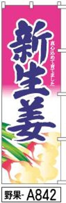 新生姜 のぼり【新生姜】[野果A842] 激安通販限定! 鮮やかなピンクのグラデーションに魅力的なショウガのイラストが印象的。道の駅や八百屋さんの青果コーナーにぴったりです。丁寧に書かれた筆文字のタイトルは、どなたにも読みやすく非常に視認性が高いのが特長です! 店頭を華やかに彩り、新鮮な新生姜の魅力を引き出します。この機会をお見逃しなく!