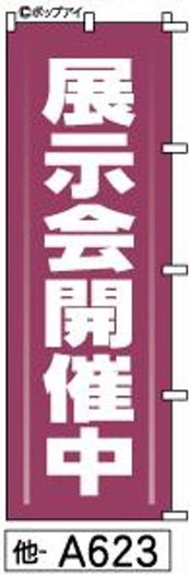 紫の白抜き文字でデザインされた「のぼり【展示会】[他A623]」は、イベントや催事にぴったりな既製品ののぼり旗です。遠くからでも視認性が高く、通りすがりの人々の目を引きつけます!特別なプロモーションやブースの設置にぜひご活用ください。華やかな外観が、あなたのイベントの雰囲気を一層盛り上げます。