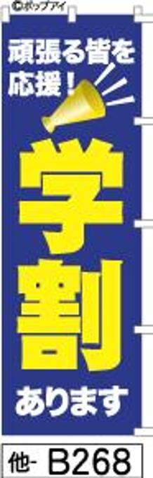 手軽にプロモーションが可能な「のぼり【学割】[他B268]」。特別な制作は不要で、すぐにご使用いただける既製品です。コストパフォーマンスもよく、繰り返し使用することでさらなる効果が見込めます。あなたのビジネスにぜひ!