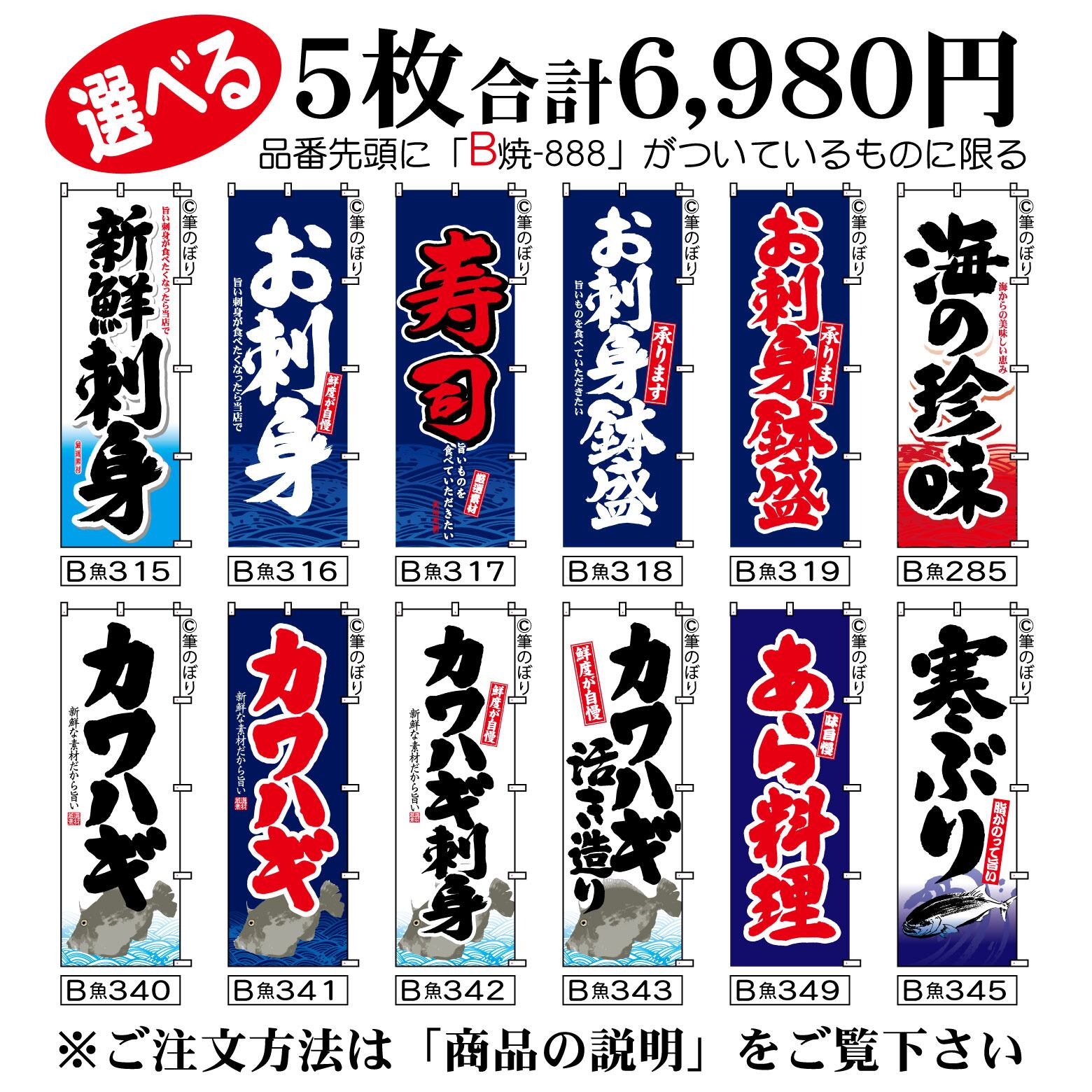 【送料無料-選べる5枚セット】お刺身 のぼり旗|カワハギ 寿司 他11種|手書き筆文字[b5-014]