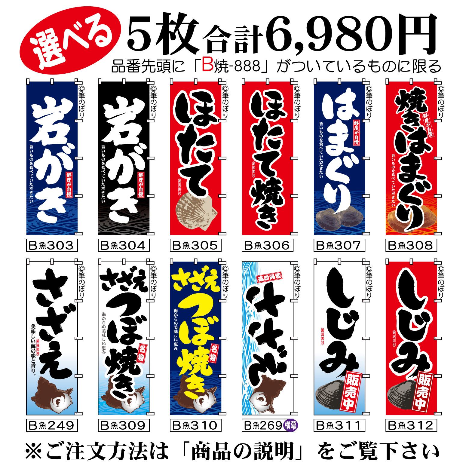 【送料無料-選べる5枚セット】岩牡蠣 のぼり旗|ほたて焼き さざえつぼ焼き 他11種|手書き筆文字[b5-016]
