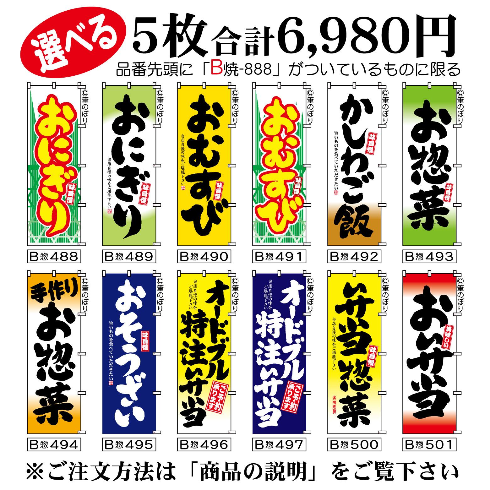 【送料無料-選べる5枚セット】弁当 のぼり旗|お惣菜 おにぎり 他11種|手書き筆文字[b5-031]