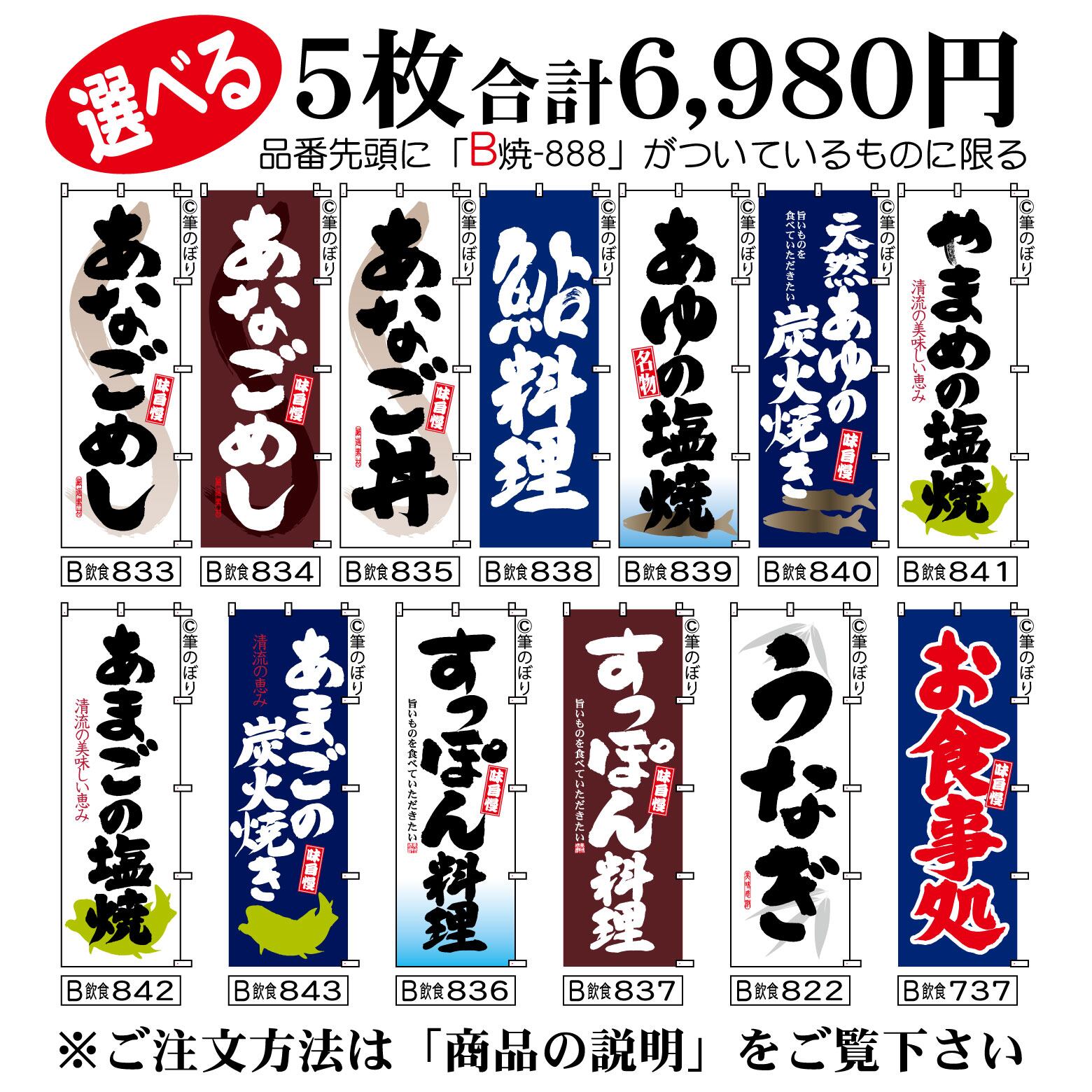 【送料無料-選べる5枚セット】あなごめし のぼり旗|鮎の塩焼き すっぽん料理 他11種|手書き筆文字[b5-070]